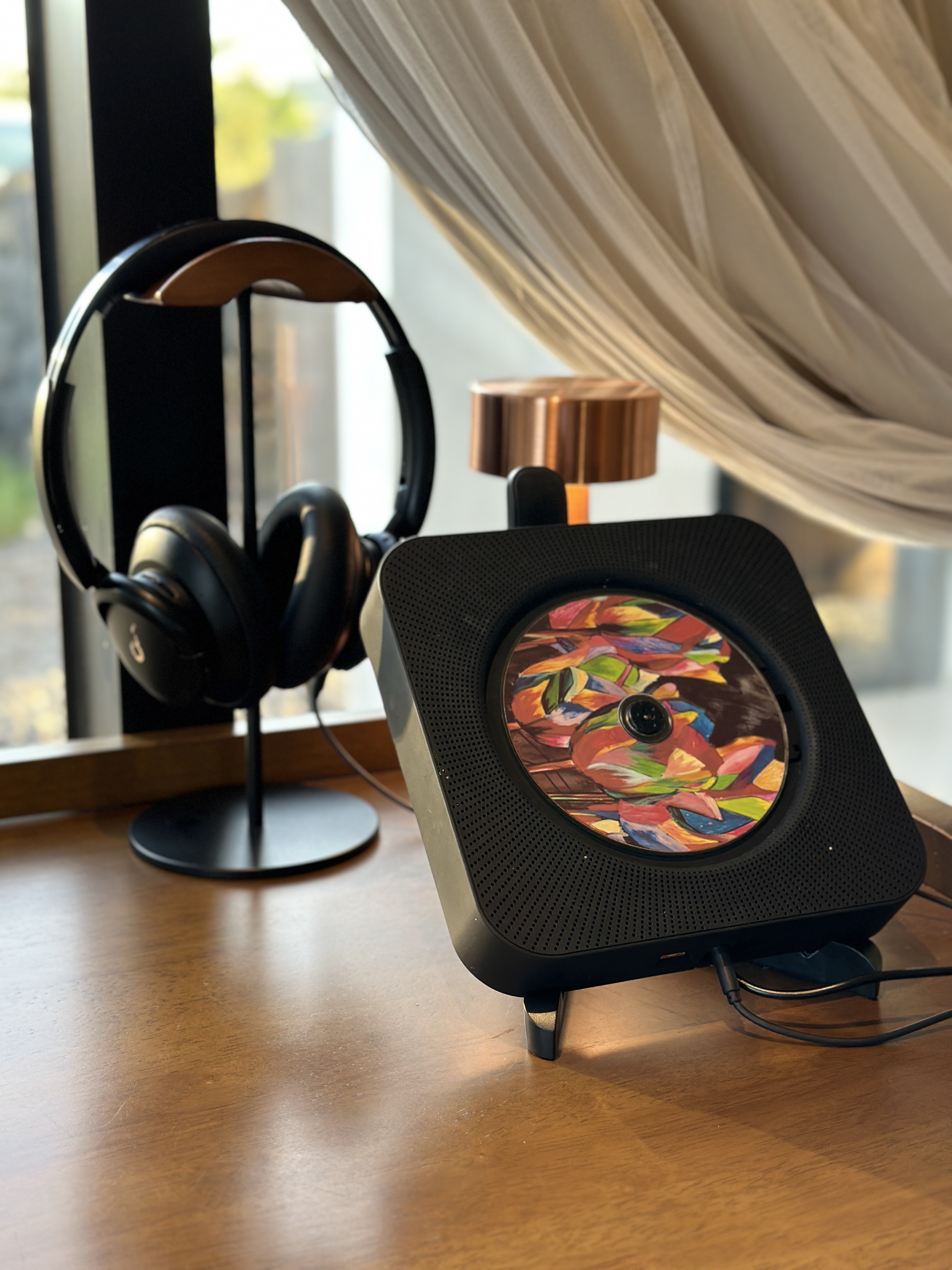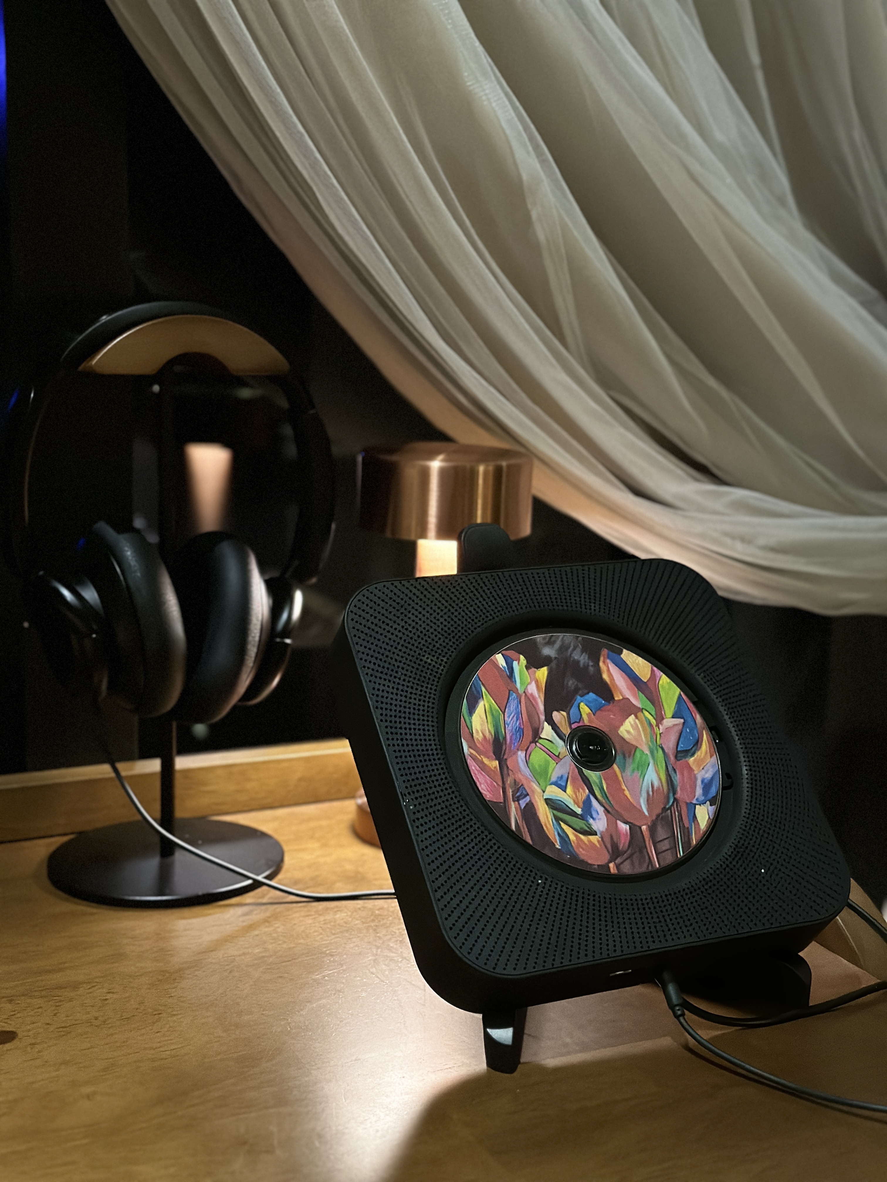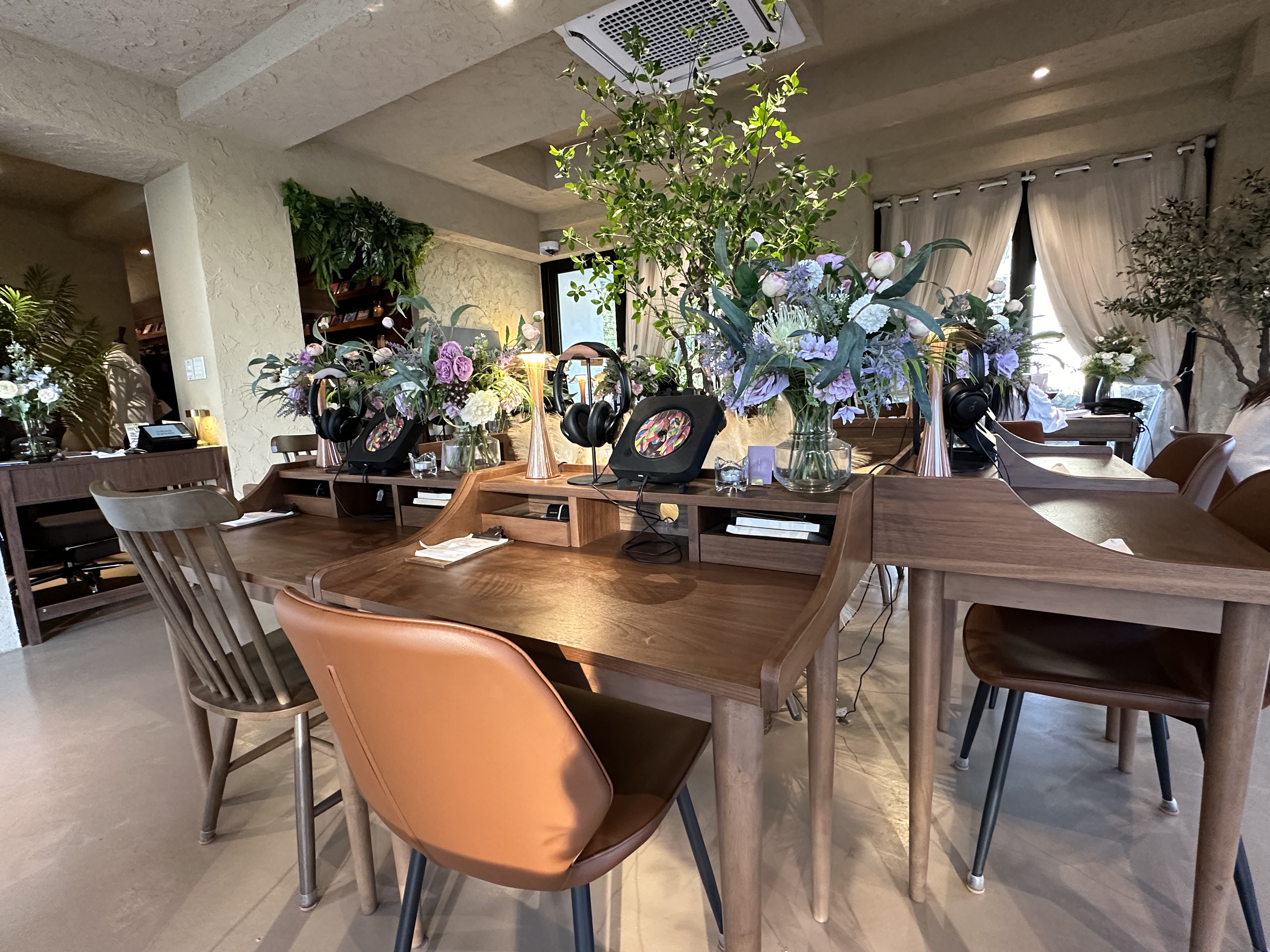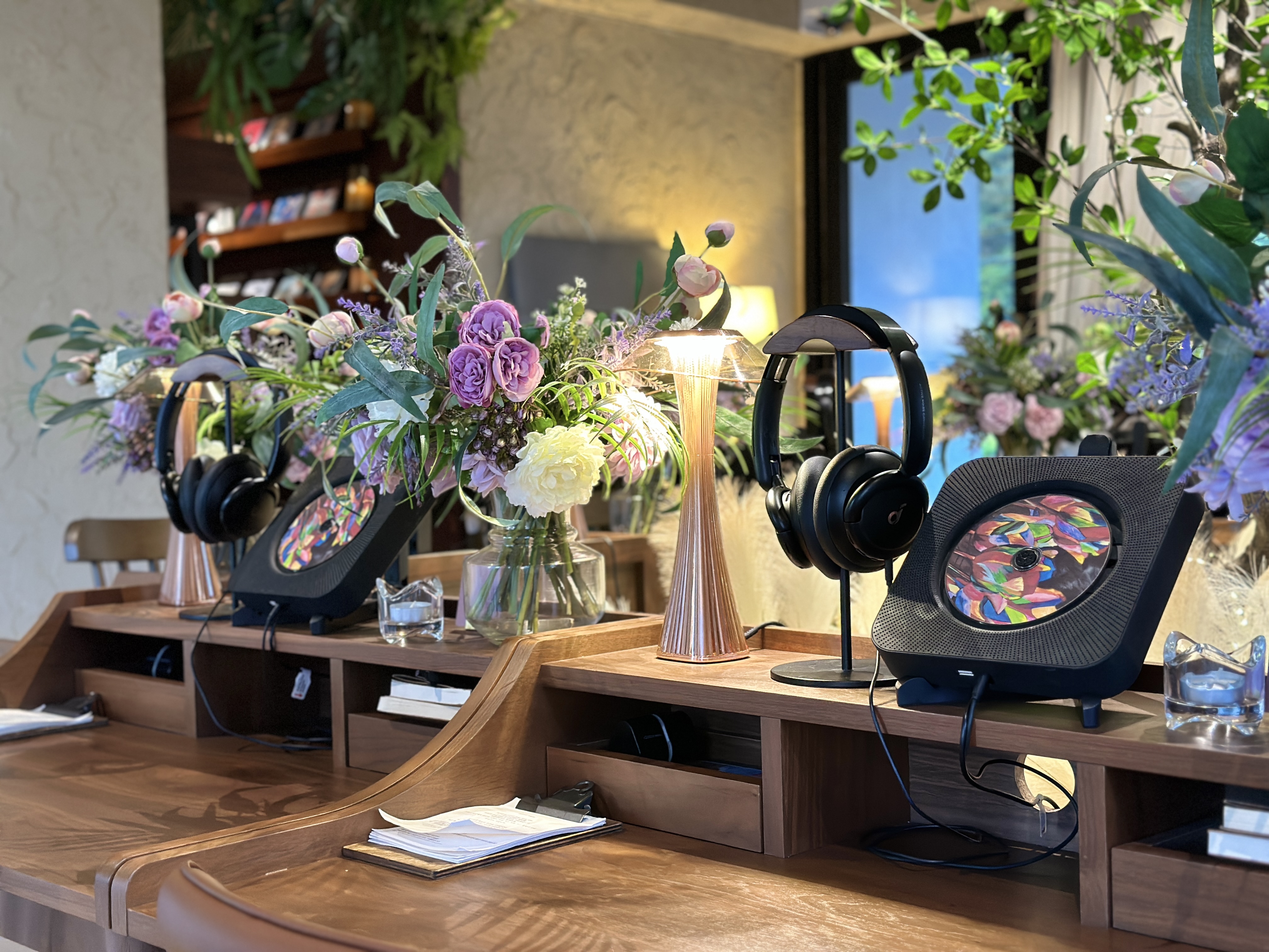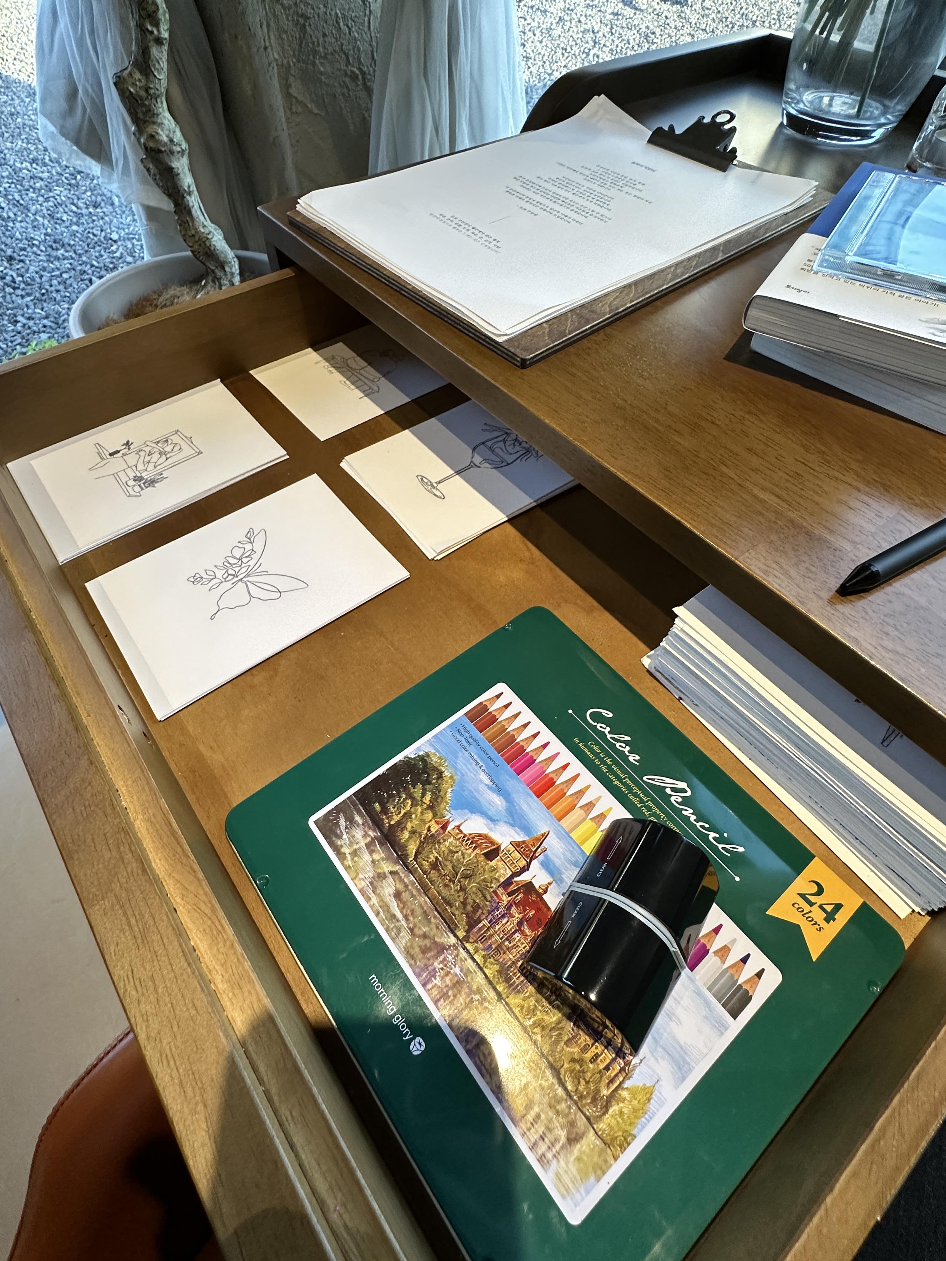 테이블 한쪽에 씨디플레이랑 헤드셋이 있고, 서랍 안을 열면 방명록, 컬러링 엽서가 있다